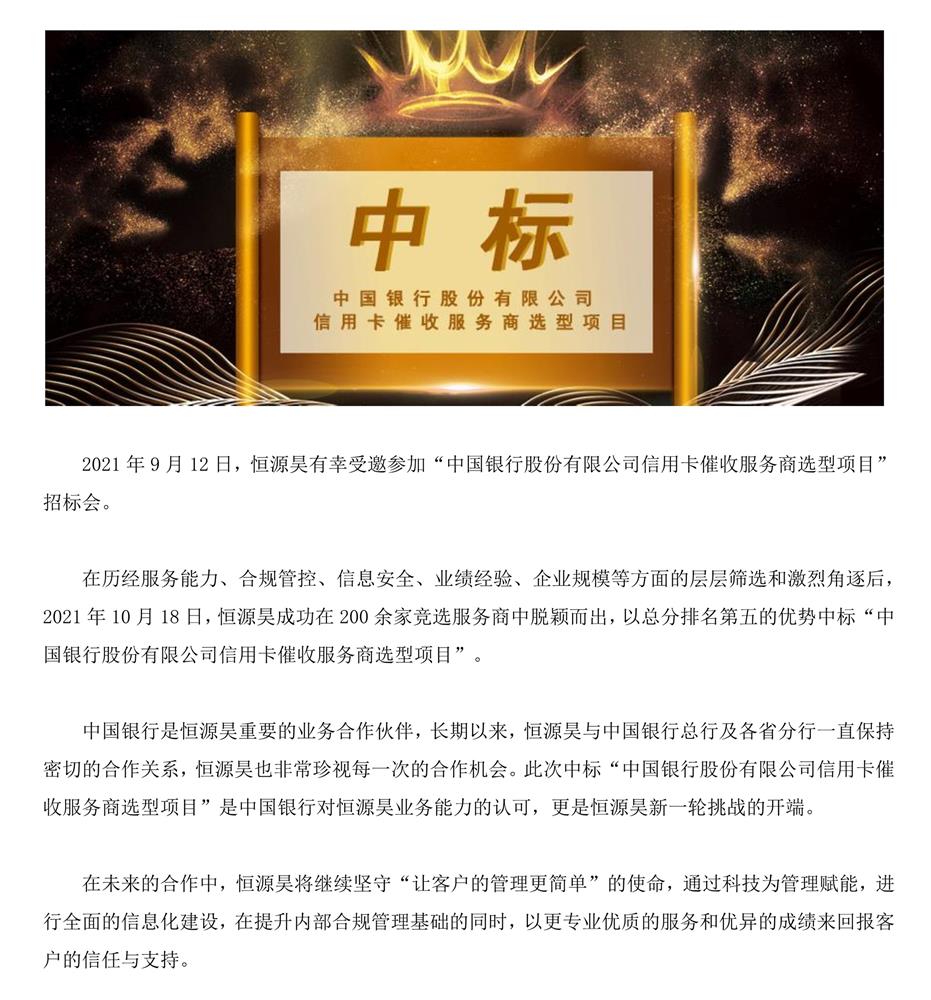 恒源昊中標(biāo)“中國銀行股份有限公司信用卡催收服務(wù)商選型項目”